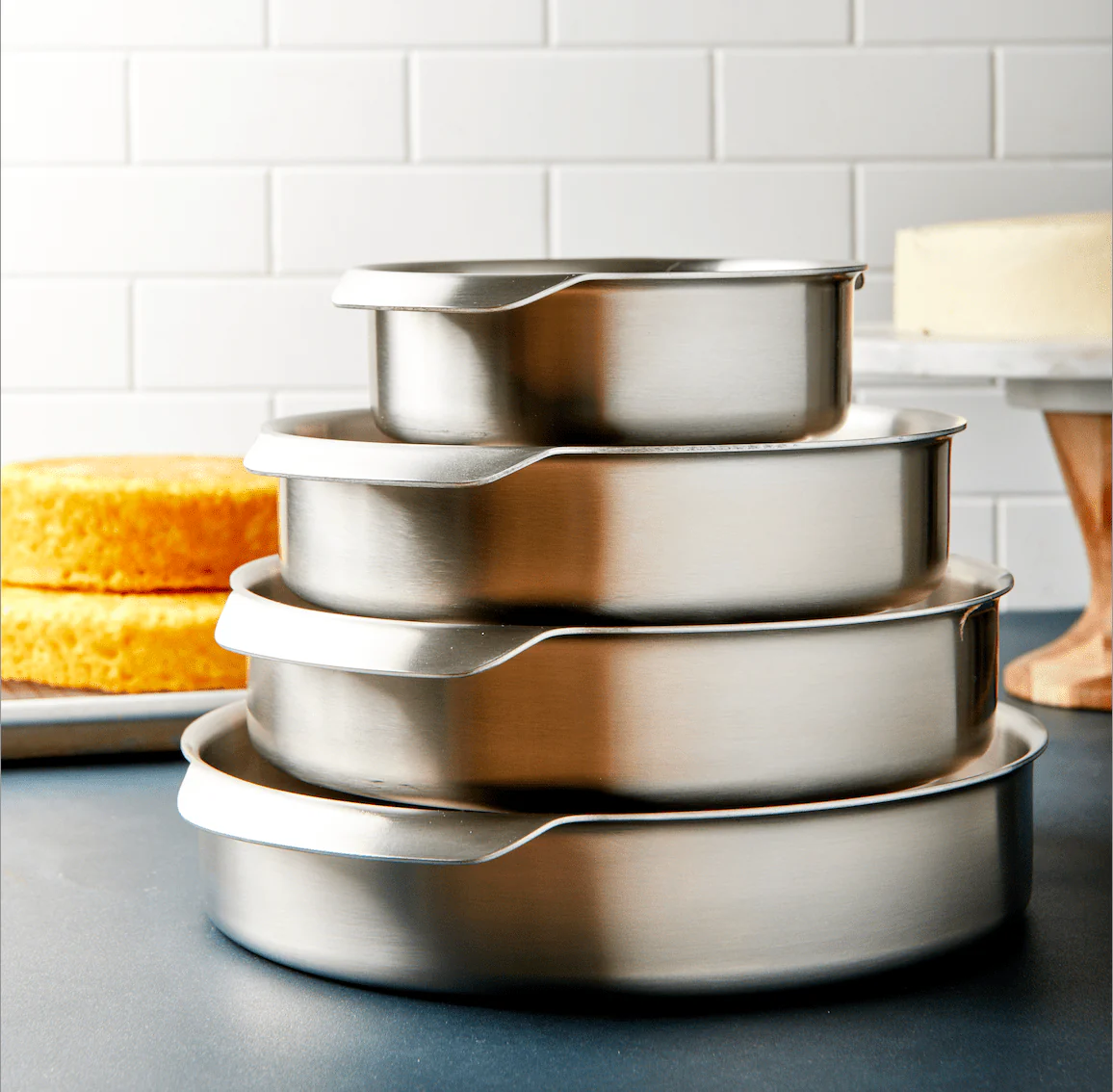 How many times have you gone to slide a hot cake pan out of the oven and stuck your oven mitt into the cake while trying to grab the pan? Never again with Kana’s line of round cake pans. Available in 6-inch, 8-inch, 9-inch and 10-inch sizes, each is complete with tall, straight sides and easy-grip handles for smooth maneuvering in and out of hot ovens and effortless flipping—a rarity on other cake pans. They’re built to last a lifetime, providing durable nontoxic performance that beats coated nonstick pans by a mile. Kana’s cake pans are tri-ply, sandwiching an aluminum core between two layers of stainless steel, so you get exceptional endurance and maximum benefit: the long-lasting durability of stainless steel, as well as the even, heat-retaining properties of aluminum (without the cheap, flimsy aluminum pans that warp). The pans are heat resistant up to 1,000℉ (583℃)—you can even use them on the grill or an open flame—handy for mixing quick caramels for upside-down cakes. And just toss them in the dishwasher when you’re done.