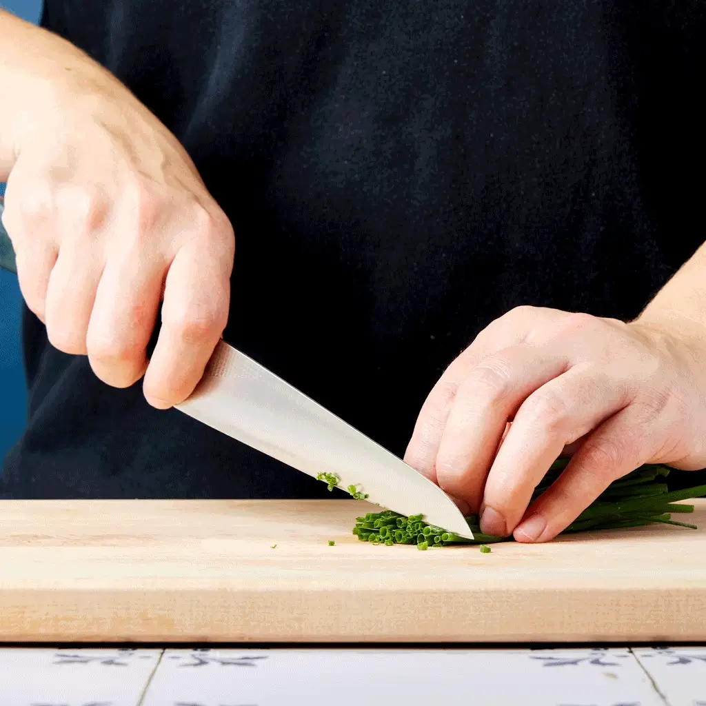 The thin, 6-inch blade is tall enough for knuckle clearance on the cutting board, yet tapers to a fine, flexible tip for detail work. The blade features a subtle curved edge from the tip, for effortless rock chopping and mincing, then flattens out towards the heel for a natural slicing motion that’s easy on your wrist.