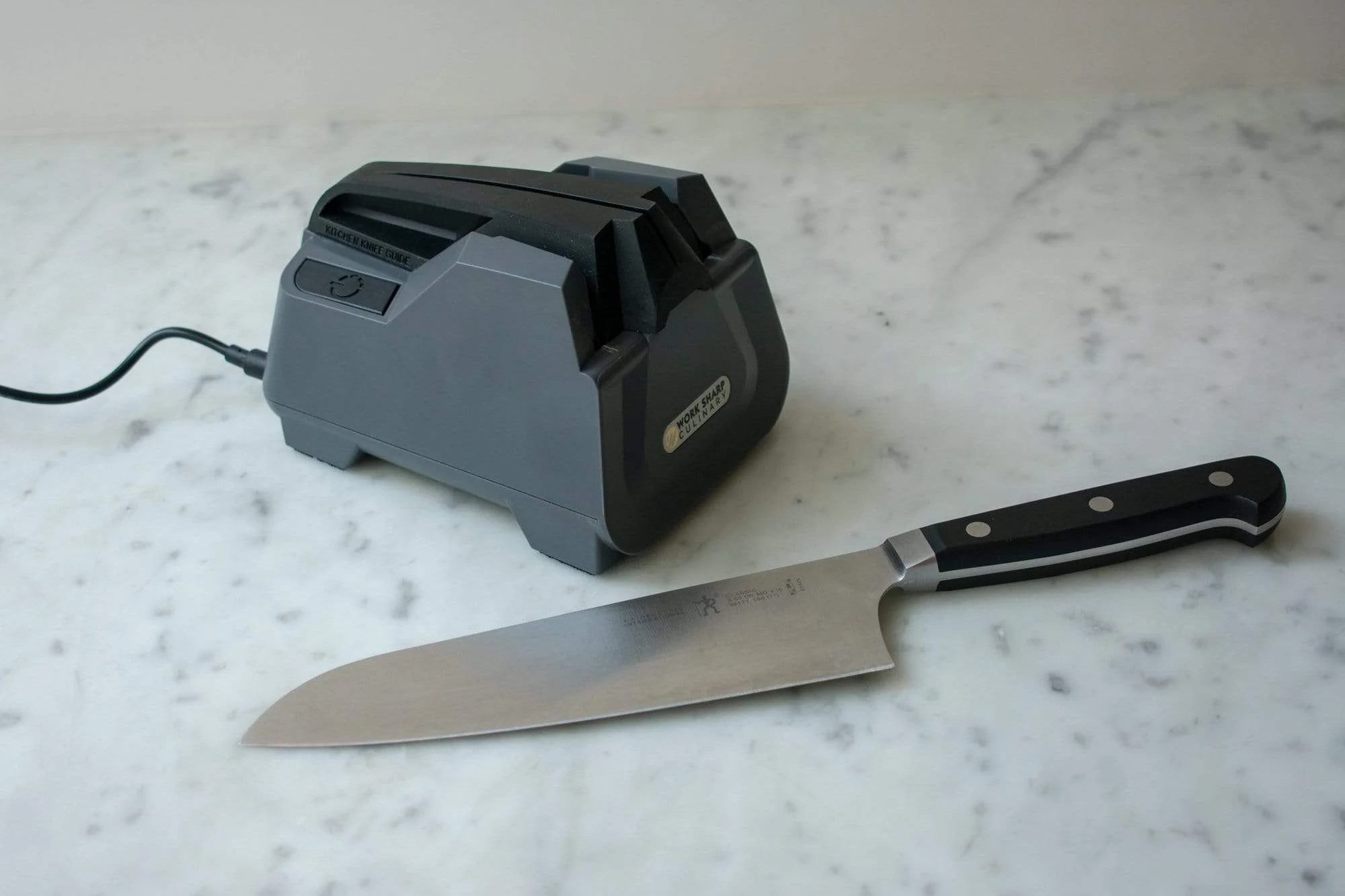 [/accordion] CARE AND USE [/title] Wipe clean.[/accordions-break]If you camp, craft or garden and have an array of cutlery to sharpen, we also offer an upgraded version of the E2.[/banner_heading] This has a second speed, stronger motor and knife guide for sharpening anything from pocket knives to cleavers—you won’t find a more useful investment in your kitchen. Upgraded model features additional guide for pocket knives, two speeds, and upgraded motor for thicker blades.[/banner-text-break]